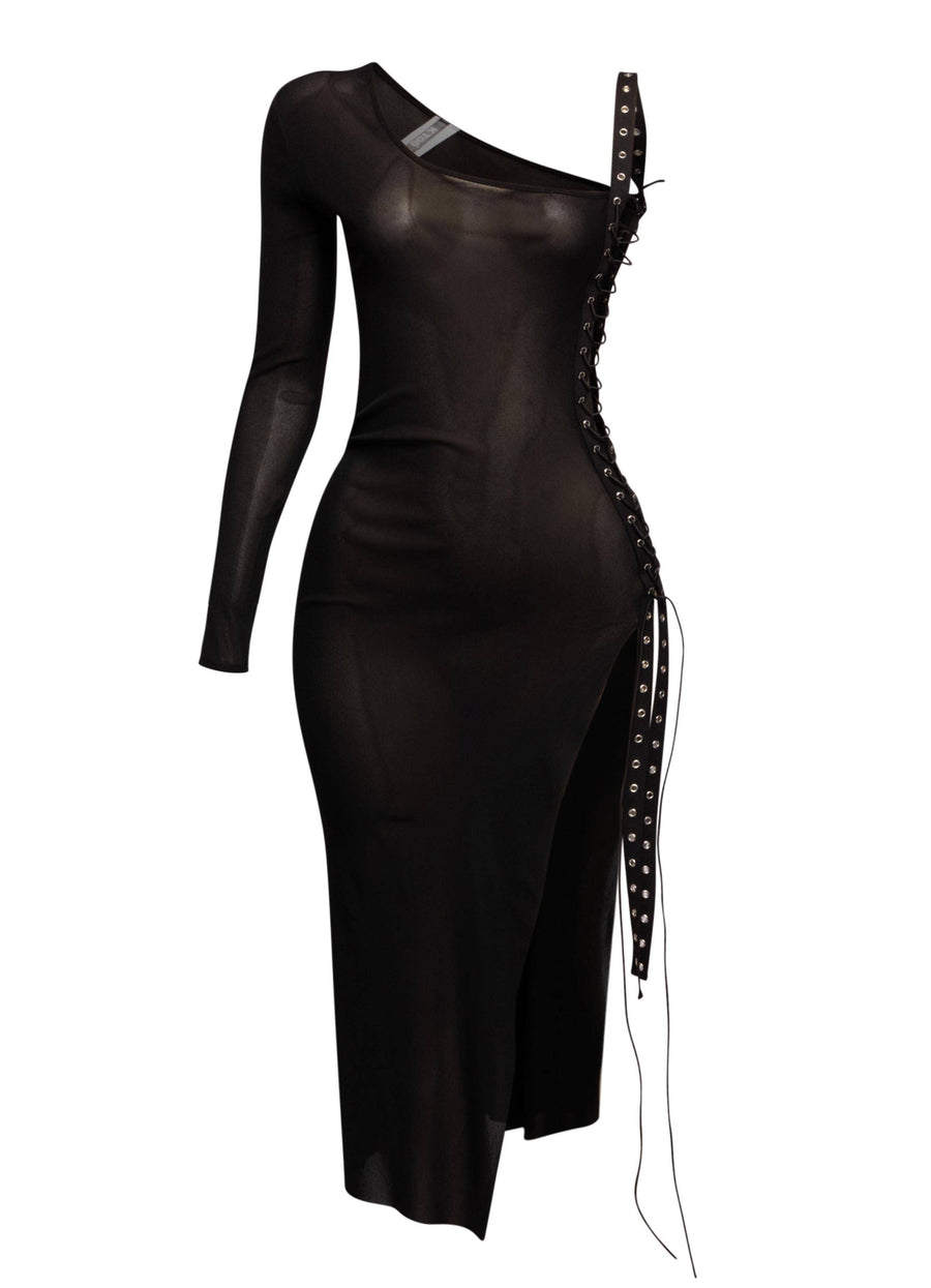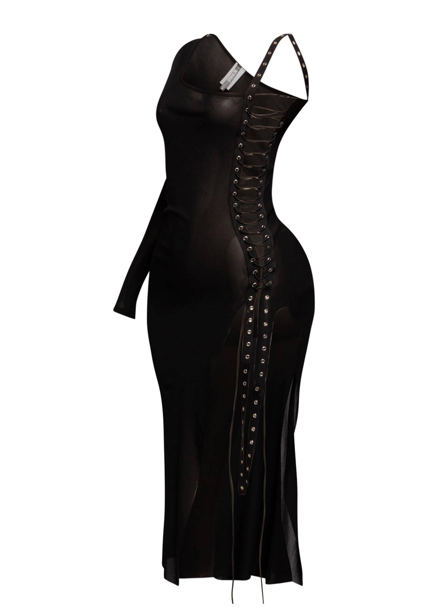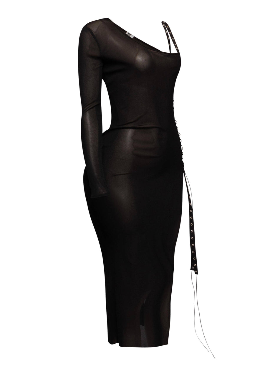 Asymmetrical One Sleeve HPS 50" Unlined Sheer Pull on Drawstring detail Slim Fit Close to the body, slightly less tight than bodycon Stretch One Color Available